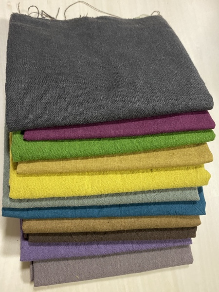 以下の布はダイソーでなく、普通の生地屋で買ったもの。大半の商品が綿75%、麻25%。下から9色目までが1m税抜880円。緑の上の鮮やかなパープルが1m税抜990円。一番上の黒が1m税抜1380円。刺し子用として使うので、全色30cm単位で買った。こういう生地、なんていうんだろう。シーチングではないと思うんだけど。