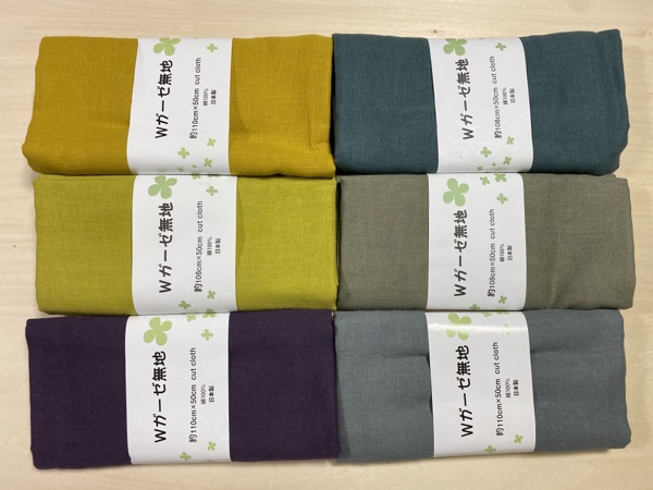 濃い色ばかり6色、いい色合い。ダブルガーゼはヤフーショッピングや楽天でも検討してたけど、現物を見て好きな色合いを選べるのは良い。