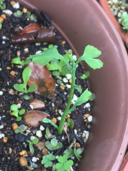 6月7日に種まきした銀杏、1ヶ月以上経ってようやく芽が出てきた。この雨降り続きで発芽が促されたのか?1ヶ月以上立つ間に鉢は他の植物の芽で一杯に…